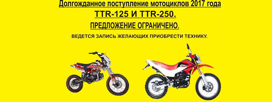 Долгожданное поступление мотоциклов TTP-125 и TTR-250 с 21 по 26 апреля. Предложение ограничено. Ведем запись желающих приобрести технику.
